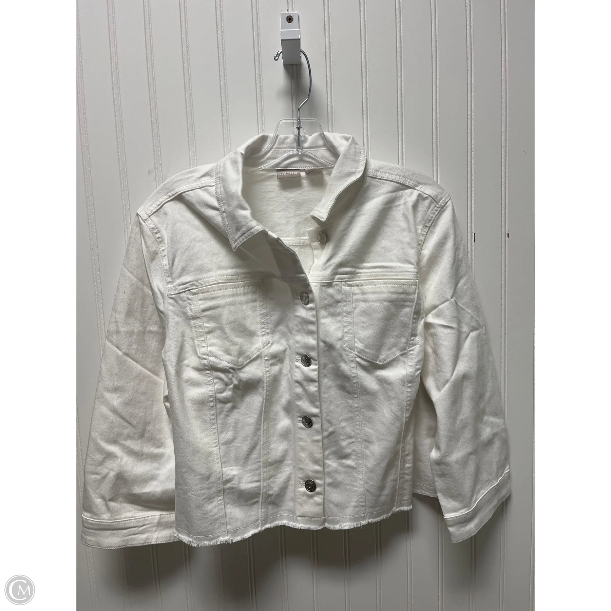 Chico's White Denim Jacket, Size L: Classic elegance meets casual comfort.
